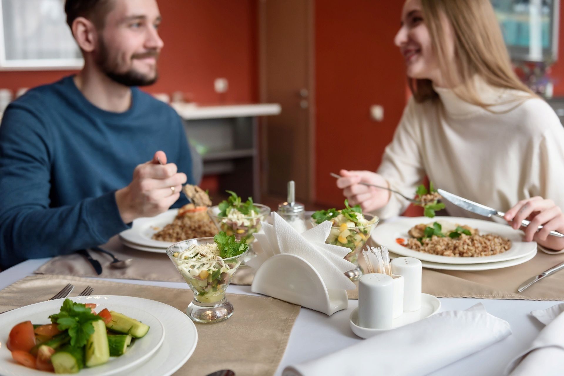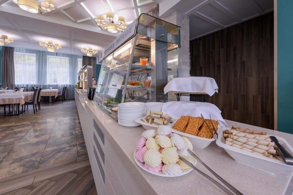 Гостям предоставляется 3-разовое питание по системе «шведский стол». Также предусмотрены другие виды питания: санаторно-курортное, диетическое, VIP питание, детское. Для детей в санатории предоставляется дополнительный полдник. В зале теплая, домашняя обстановка. Гостей ждет отличное обслуживание, приготовление вкусных блюд, хорошее настроение, внимание и гостеприимство. Для проживающих в люксе питание организовано VIP-зале. Летом открывается кафе рядом с корпусом, На первом этаже работает бар. В уютном лобби-баре можно выпить чашечку ароматного кофе, оздоровиться травяным чаем, отведать выпечку собственного производства.