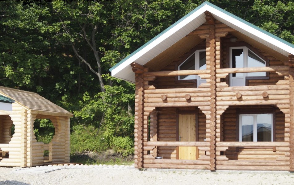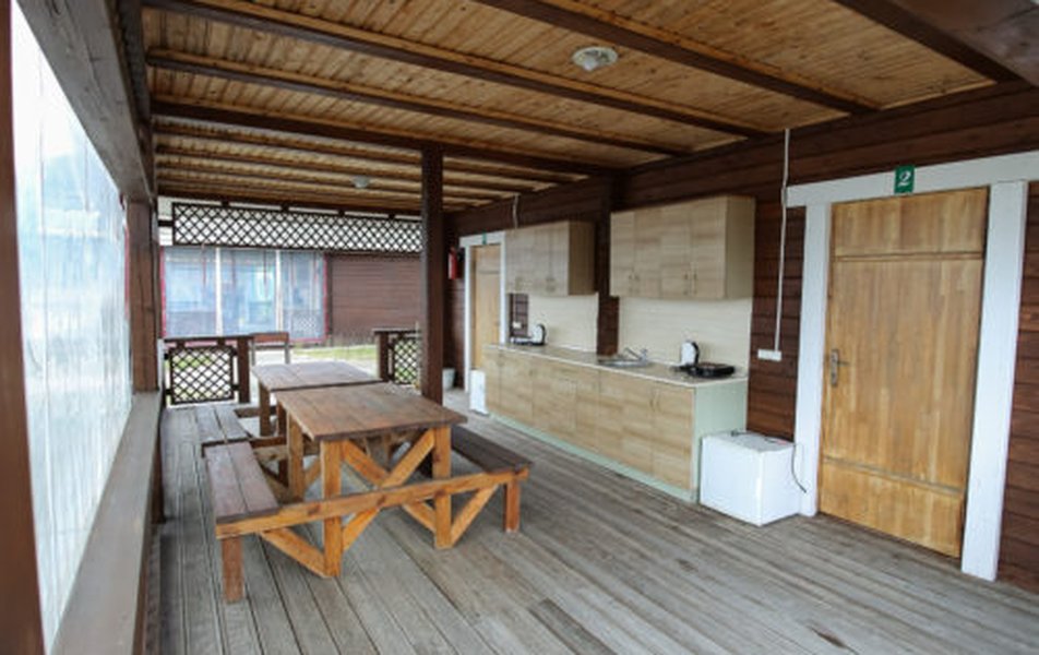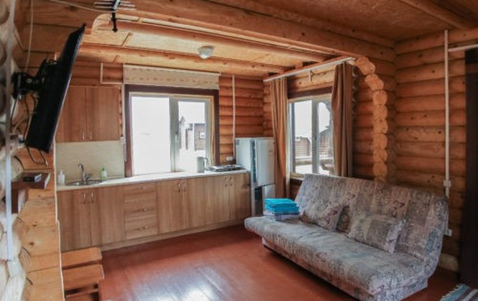 В домике: кровати односпальные, кухонная мебель, прикроватные тумбочки, стол, стулья, мини-кухня, мини-холодильник, набор посуды, плита электрическая, телевизор, электрочайник