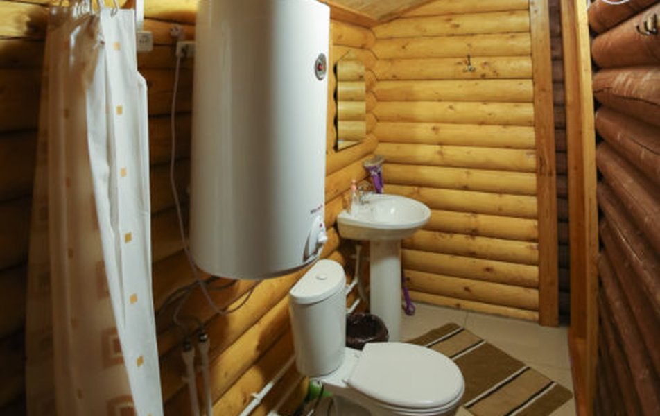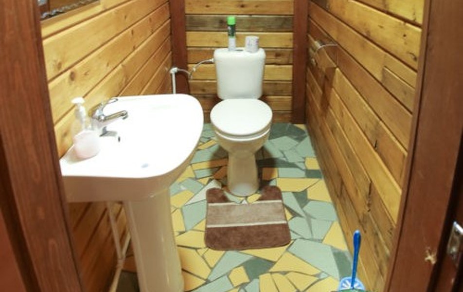 Санузел: душ, раковина, унитаз, тапочки, туалетные принадлежности