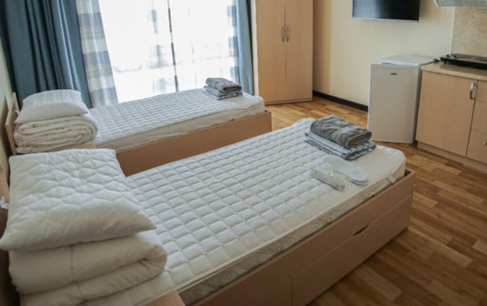 В номере: кровати односпальные /одна двуспальная кровать, кухонная мебель, прикроватные тумбочки, стол, стулья, мини-кухня, кондиционер, мини-холодильник, набор посуды, плита электрическая, телевизор, электрочайник