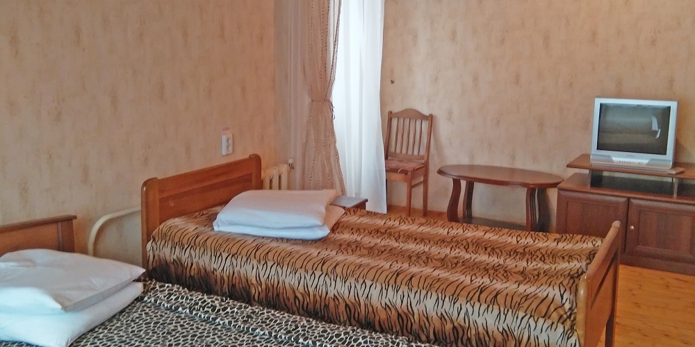 В номере: две односпальные кровати, прикроватные тумбы, стол, стулья, шкаф-купе, холодильник, телевизор