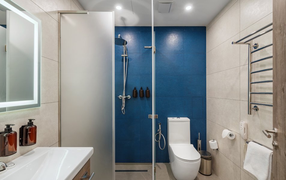 Санузел: биде, с душевой кабиной, тапочки, туалетные принадлежности, фен, халат