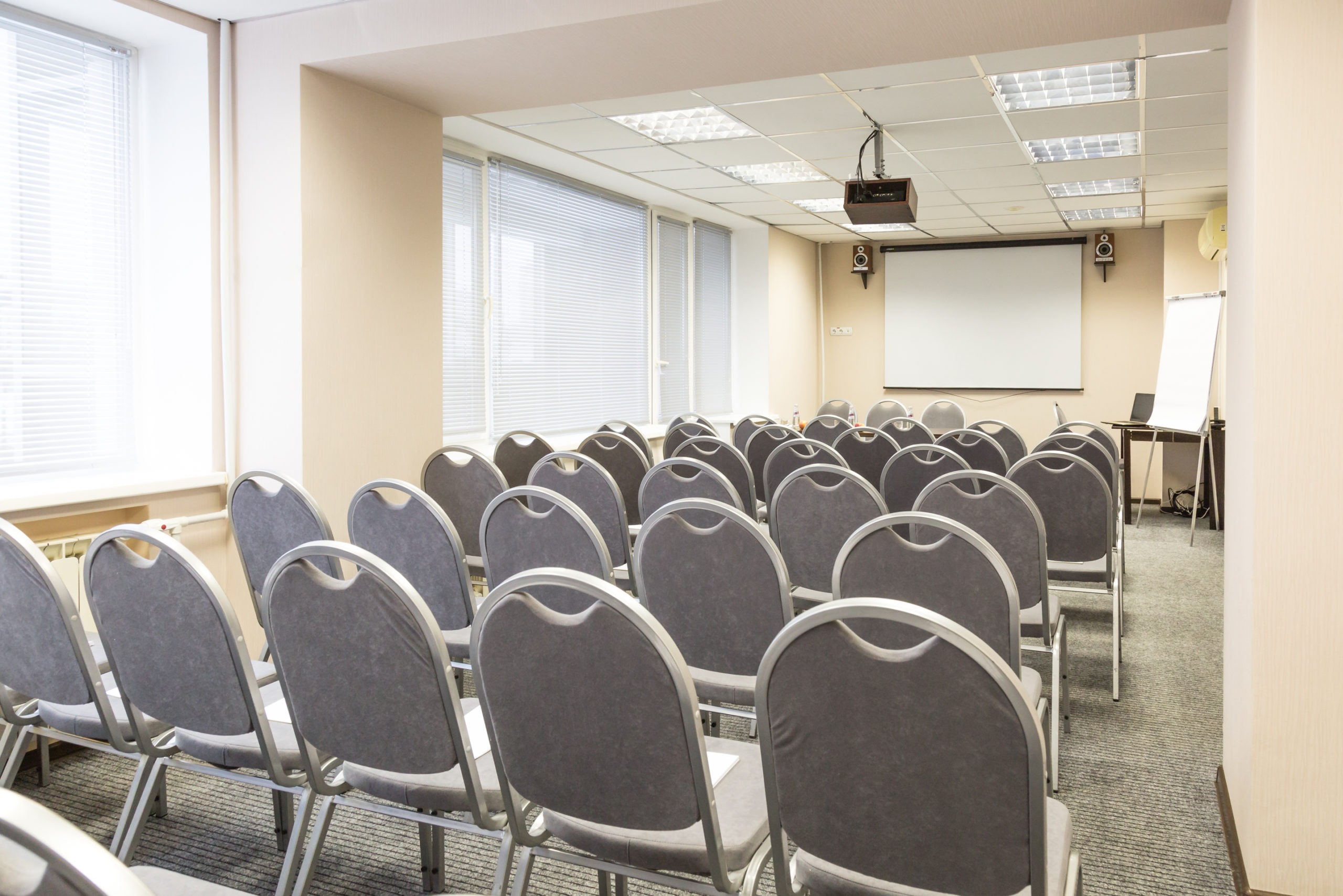 Современный конференц-зал в строгом лаконичном стиле – оптимальный вариант для проведения деловых мероприятий и совещаний.