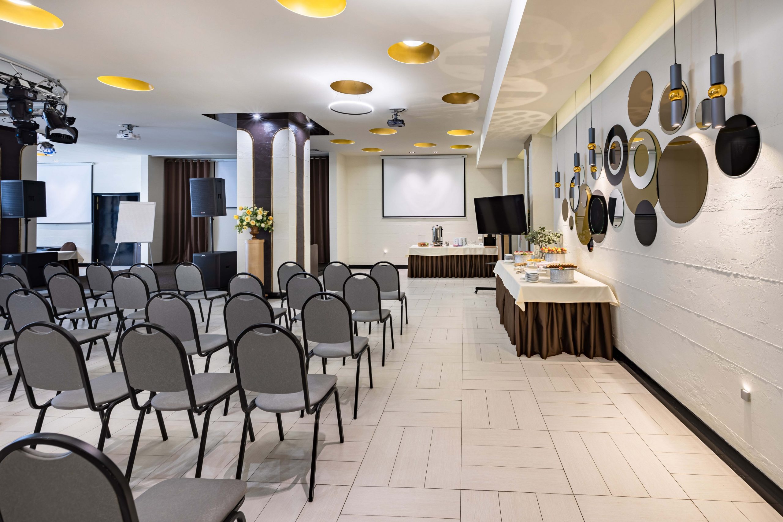 Элегантный зал «Модерн» идеально подходит для проведения торжественных и деловых мероприятий большого масштаба.