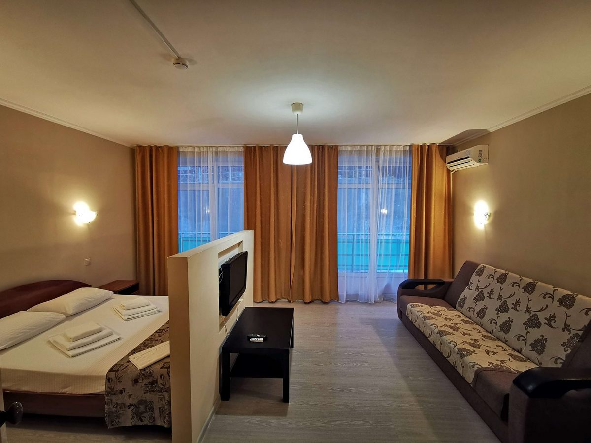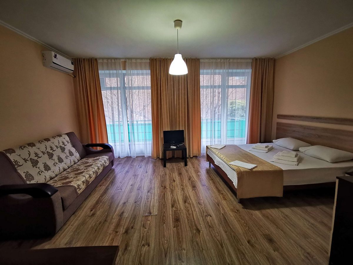 В номере: двуспальная кровать, прикроватные тумбы, стол, стул, диван, шкаф, комод, телевизор, холодильник, кондиционер, электрочайник
