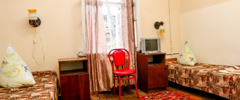 В номере: кровати, шкаф, тумбочка, холодильник, телевизор, вентилятор по требованию