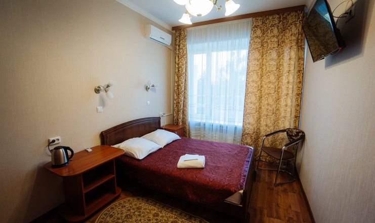 В номере: кровати односпальные или одна двуспальная, прикроватные тумбочки, стол, стул, шкаф, телевизор, холодильник, телефон, чайный набор посуды, электрочайник