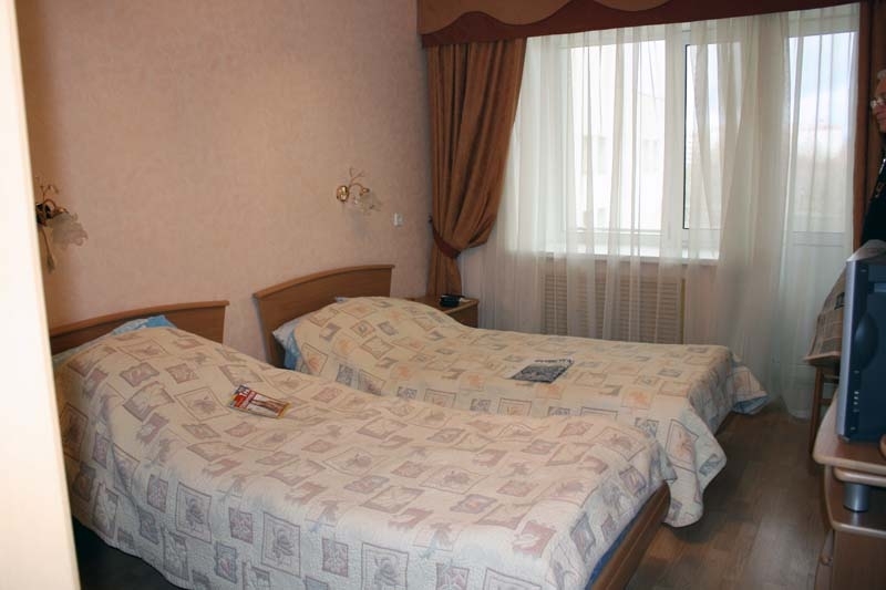 В номере: две 1.5-спальные кровати, тумбочка, стул, столик, шкаф для одежды, телевизор, холодильник.