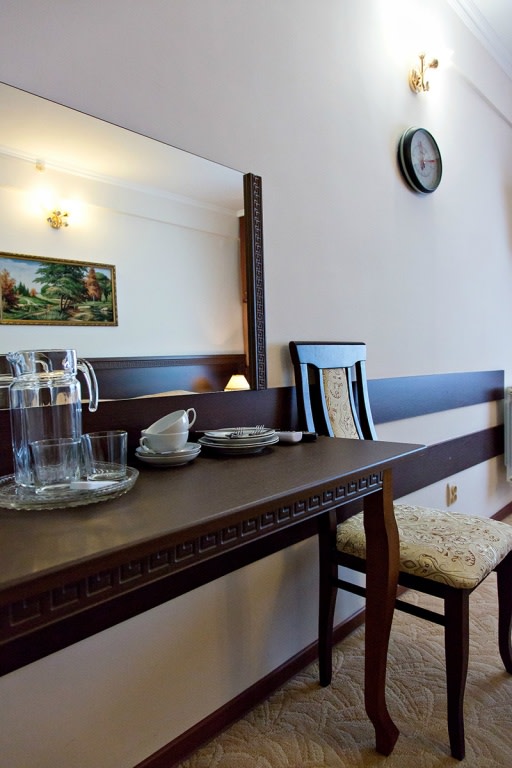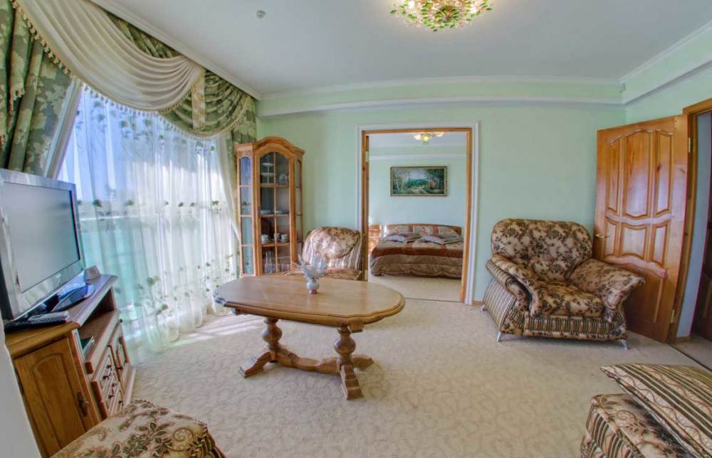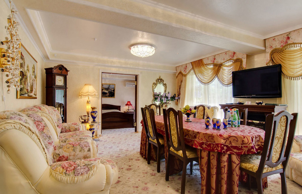 В номере: две комнаты: спальня и гостиная, двуспальная кровать, прикроватные тумбы, посудный шкаф, стол, стулья, комод, пуф, мягкая мебель, шкаф/гардероб, мини-холодильник, телевизор, телефон, кондиционер
