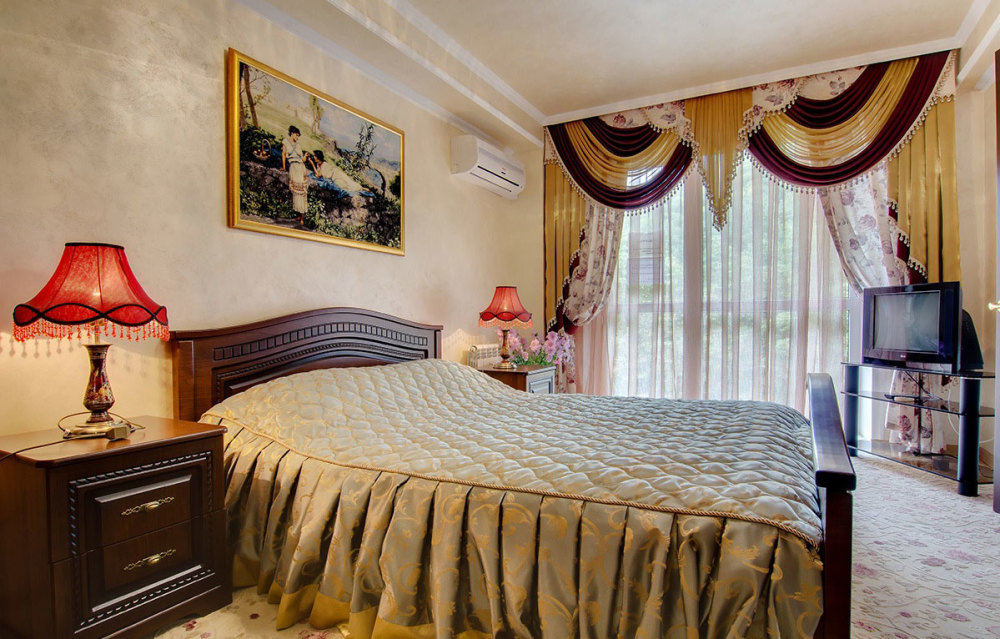 В номере: двуспальная кровать, прикроватные тумбы, стол, стулья, шкаф, холодильник, телевизор, набор посуды