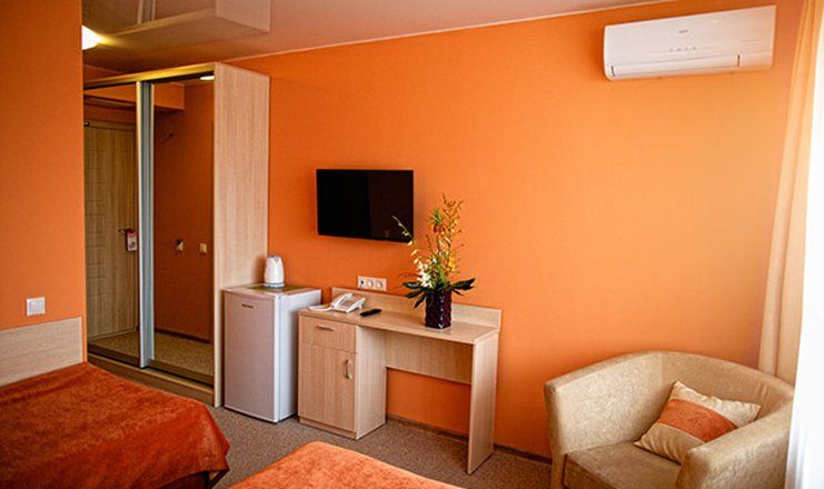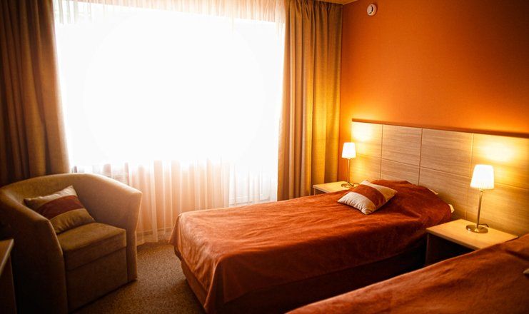 Оснащение номера: две односпальные кровати, прикроватные тумбочки, стол, стул, кресло, шкаф для одежды, кондиционер, телефон, холодильник