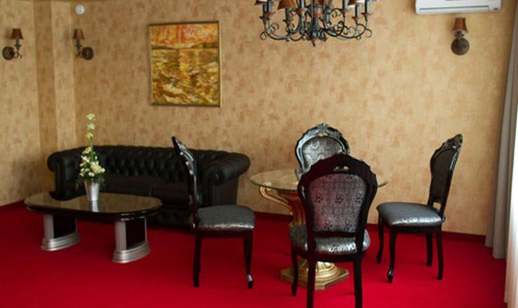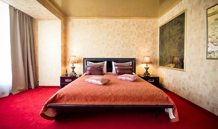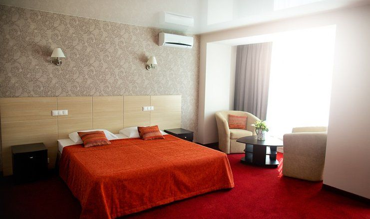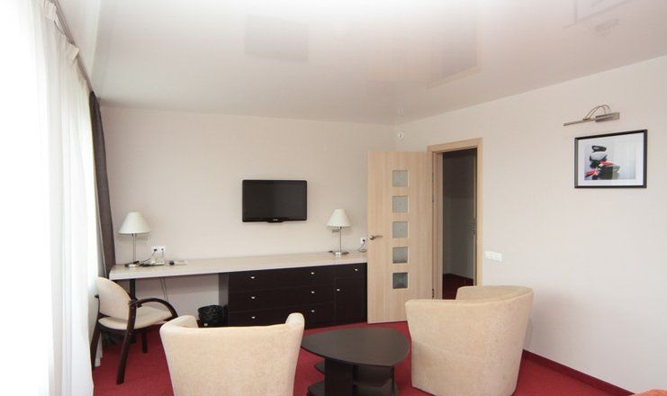 Оснащение номера: двуспальная кровать, прикроватные тумбочки, стол, стулья, кресла, журнальный столик, шкаф для одежды, кондиционер, телевизор, телефон, холодильник