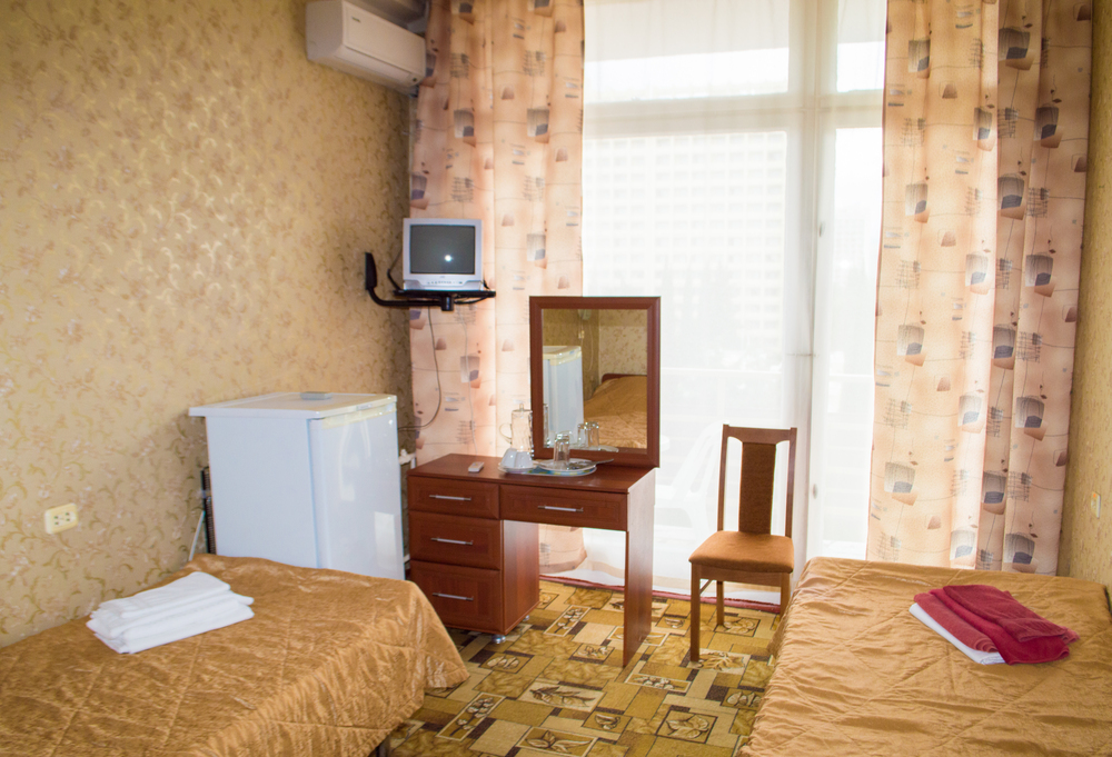 В номере: две односпальные кровати, прикроватные тумбы, шкаф для одежды, стол, стул, телевизор, зеркало, набор посуды, мини-холодильник, кондиционер