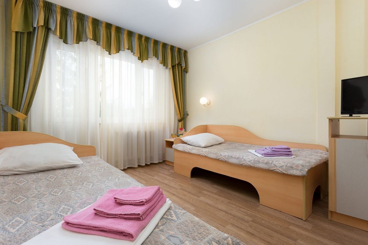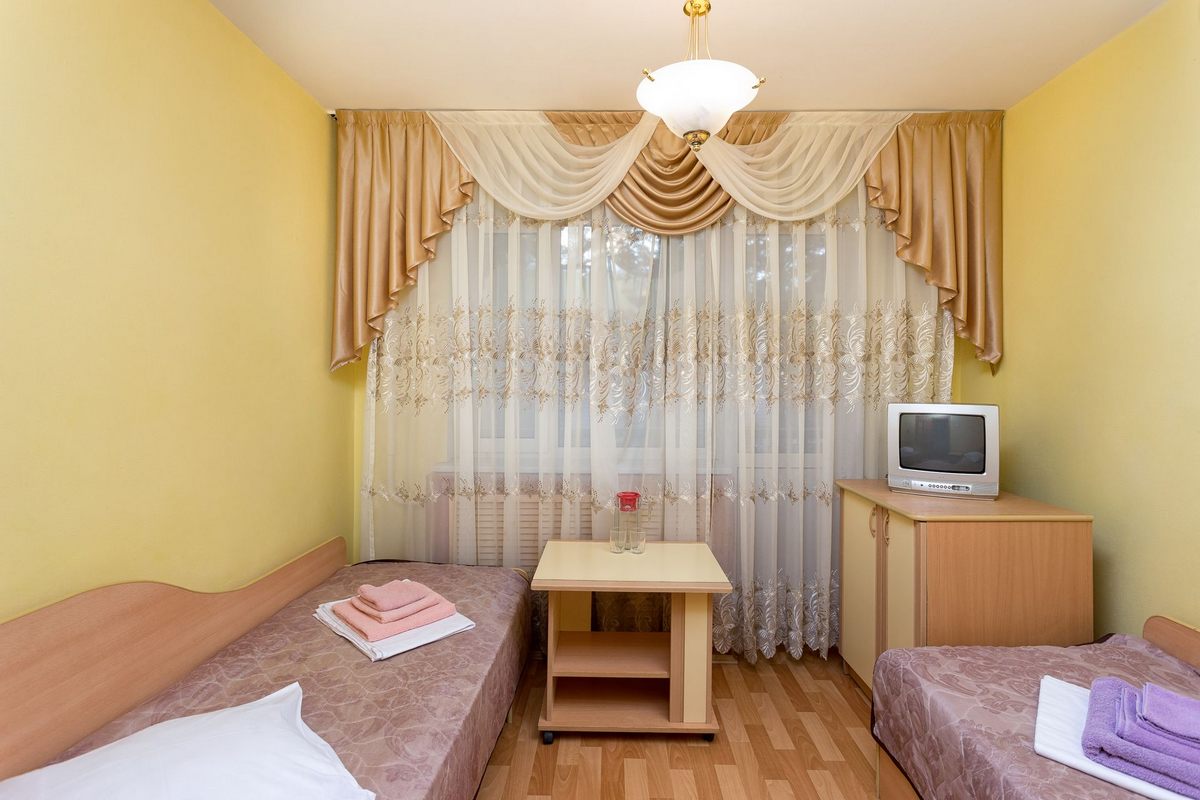 В номере: две односпальные кровати, прикроватные тумбы, стол, холодильник, телевизор, wi-fi