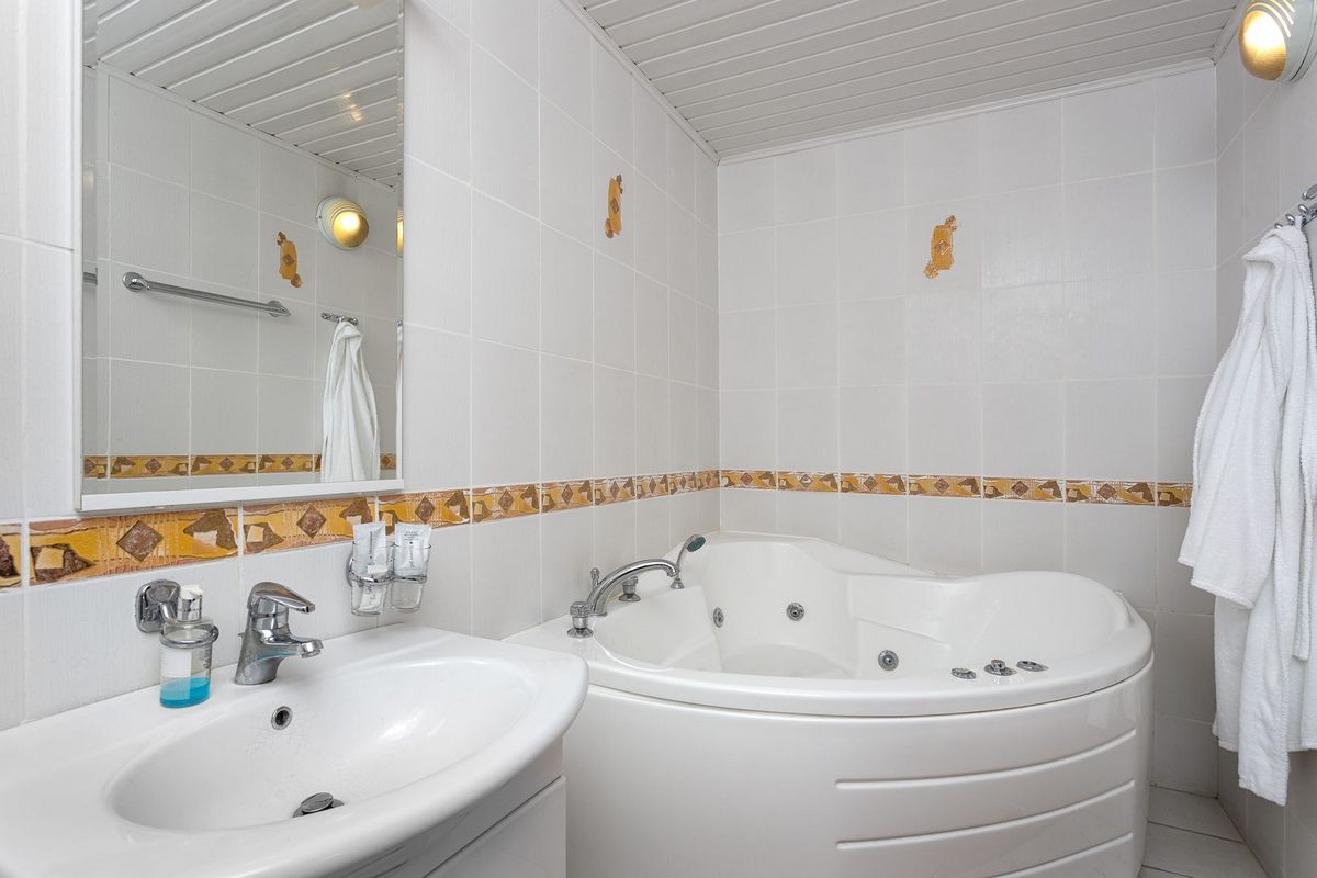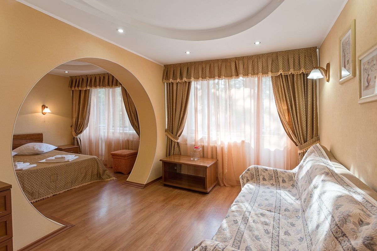 В номере: две комнаты: спальня и гостиная, две односпальные кровати или одна двуспальная, прикроватные тумбы, кресло, шкаф, стол, стенка, стол, холодильник, телевизор, wi-fi