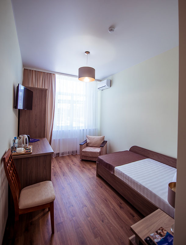 В номере: односпальная кровать, прикроватные тумбы, шкаф для одежды, полка, кресло-кровать, телевизор,  интернет Wi-Fi, холодильник, кондиционер, посуда