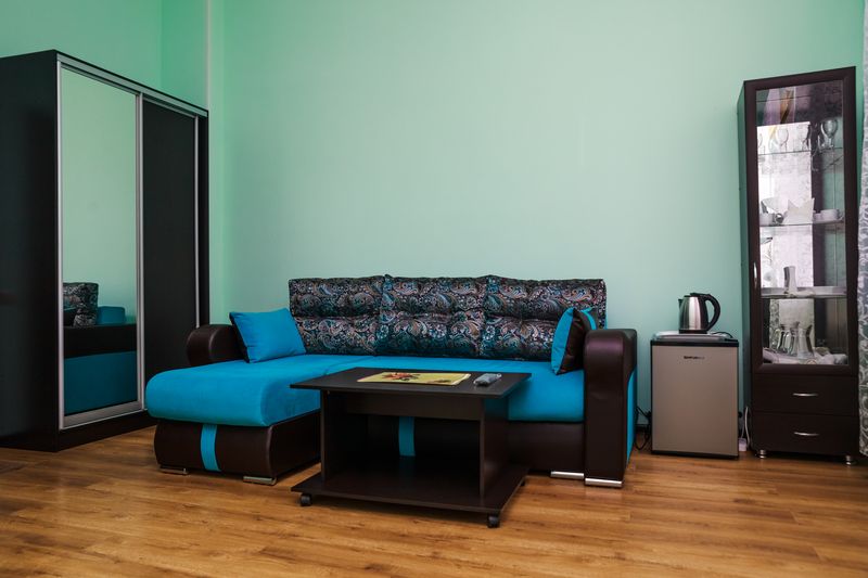 В номере: вешалка, диван раскладной, зеркало, комод, кровать двуспальная, прикроватные тумбочки, стол, столик журнальный, стул, шкаф-купе, шкаф для посуды, мини-холодильник, набор посуды, телевизор ЖК, чайный набор посуды, электрочайник