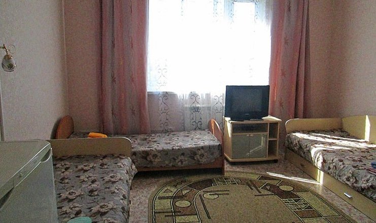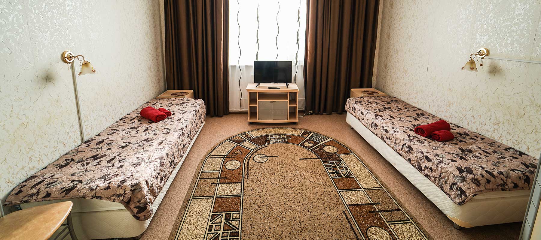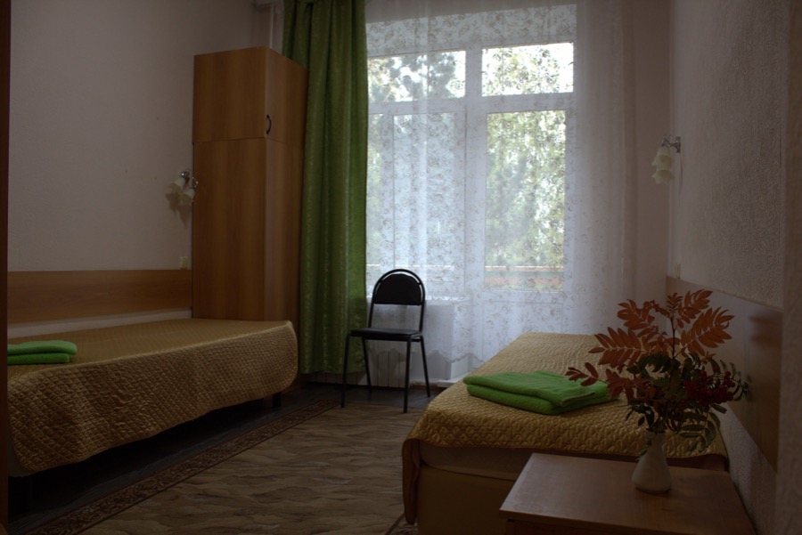 В номере: кровати полутораспальные, прикроватные тумбочки, шкаф, телевизор, холодильник