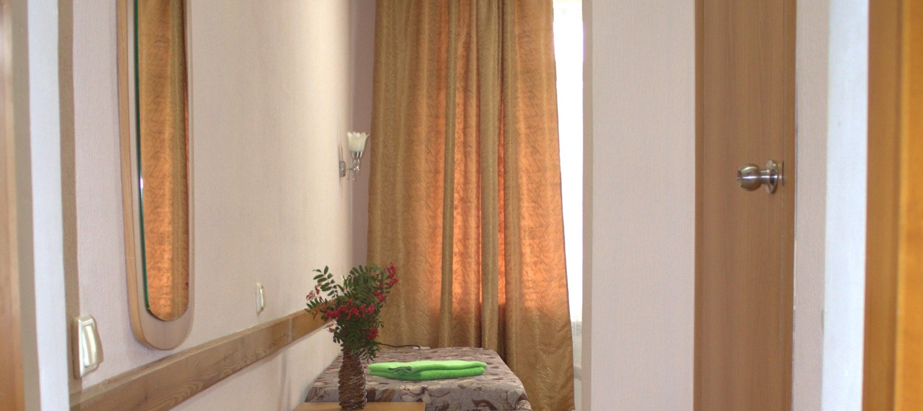 В номере: кровати полутораспальные, прикроватные тумбочки, шкаф, журнальный стол, телевизор, холодильник