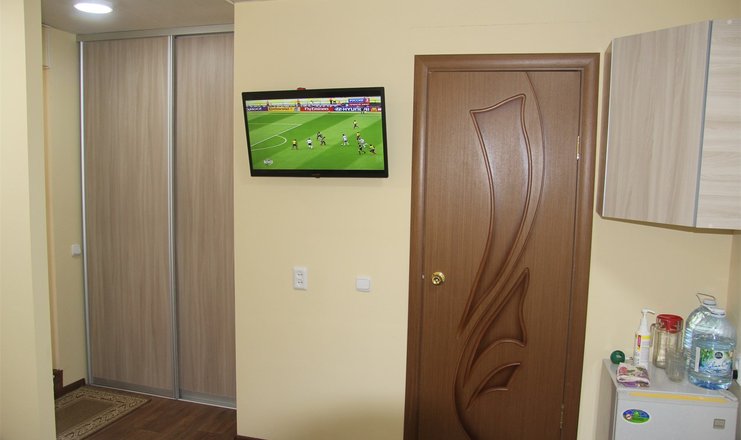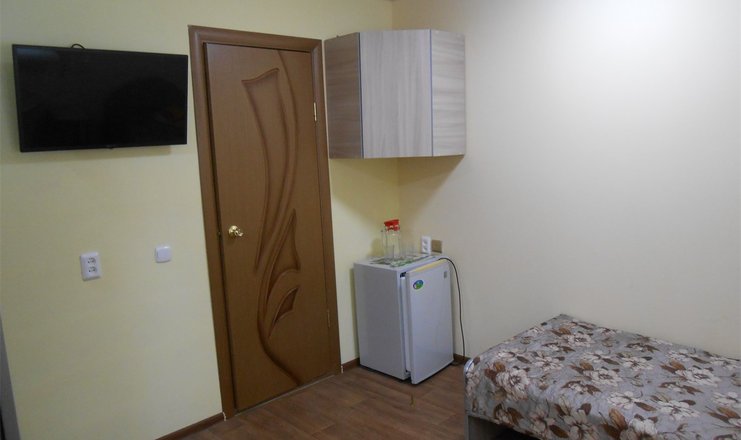 В номере: кровать полутораспальная, прикроватная тумбочка, шкаф, телевизор, холодильник