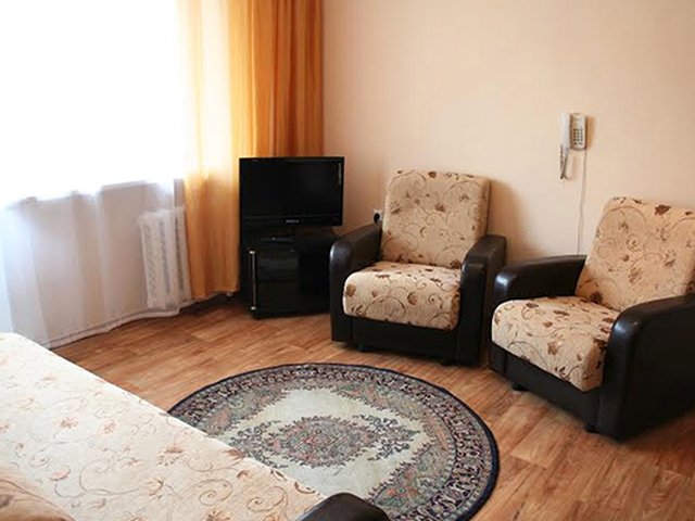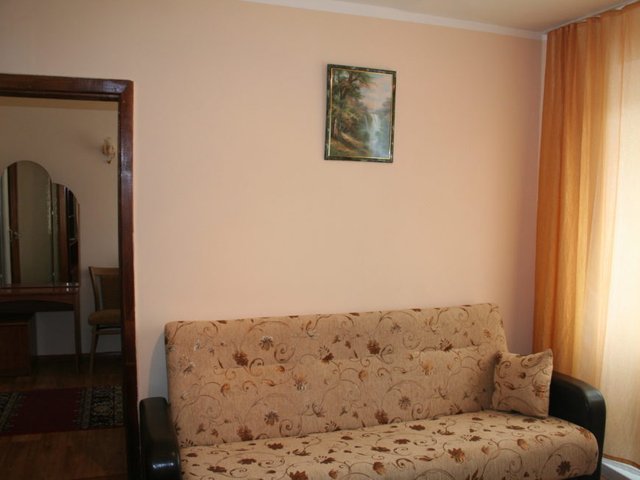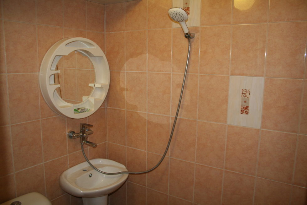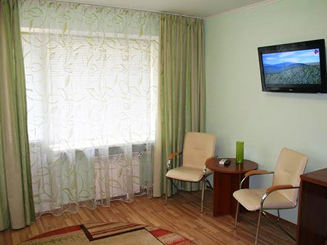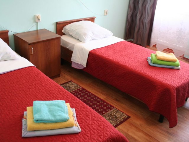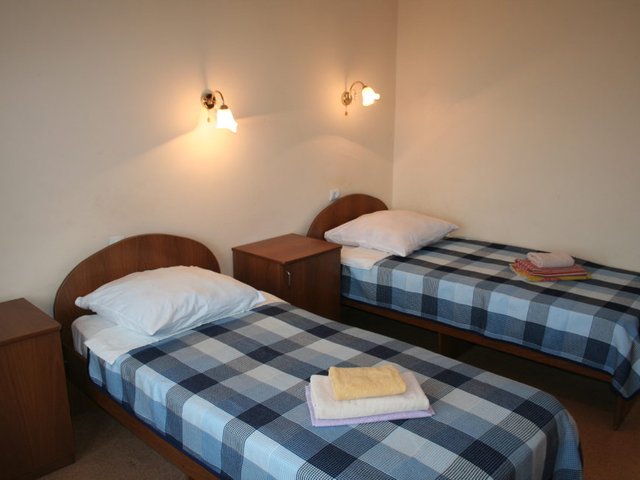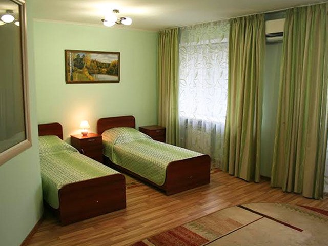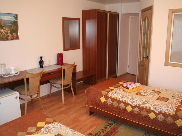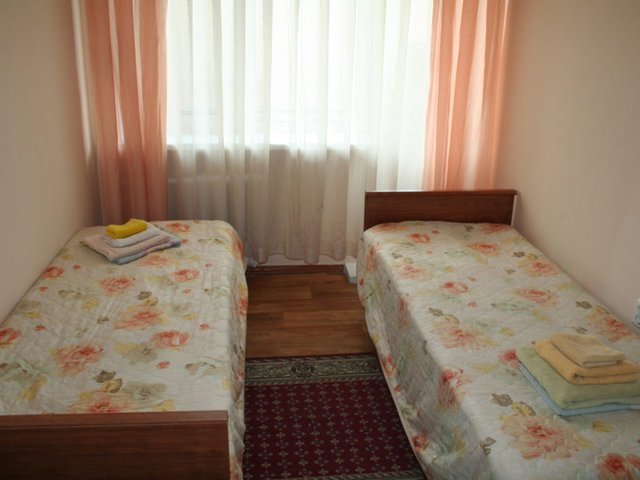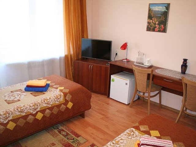 В номере: вешалка, зеркало, кровати односпальные, прикроватные тумбочки, стол, стулья, шкаф-купе, гладильная доска, телевизор, утюгхолодильник, чайный набор посуды, электрочайник
