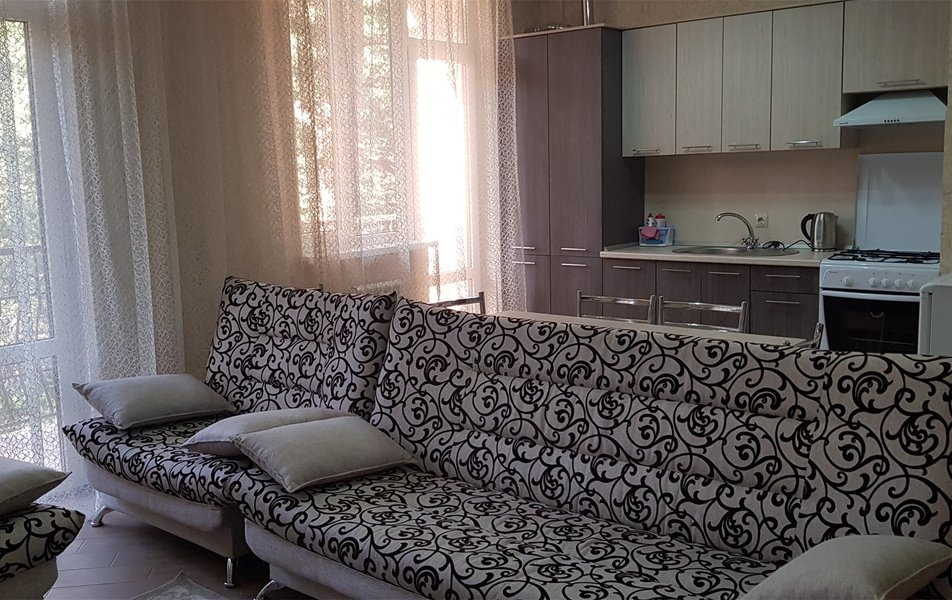 В номере: Кухня, вешалка, зеркало, кровати односпальные, прикроватные тумбочки, стол, стулья, шкаф, микроволновая печь, мини-холодильник, набор посуды, плита электрическая, телевизор, чайный набор посуды, электрочайник