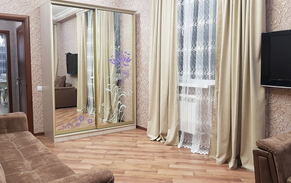 В номере: Кухня, вешалка, диван, зеркало, кресла, кровать двуспальная, прикроватные тумбочки, стол, стулья, шкаф, набор посуды, плита электрическая, телевизор, холодильник, чайный набор посуды, электрочайник