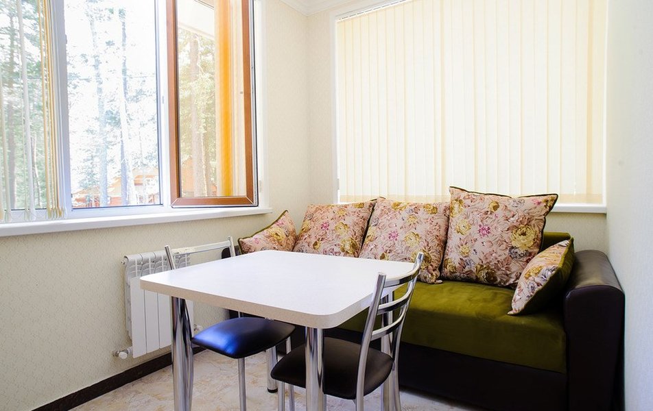 В номере: вешалка, диван раскладной, зеркало, кровать двуспальная, прикроватные тумбочки, стол, стулья, шкаф, Мини-кухня, набор посуды, плита электрическая, телевизор, холодильник, чайный набор посуды, электрочайник