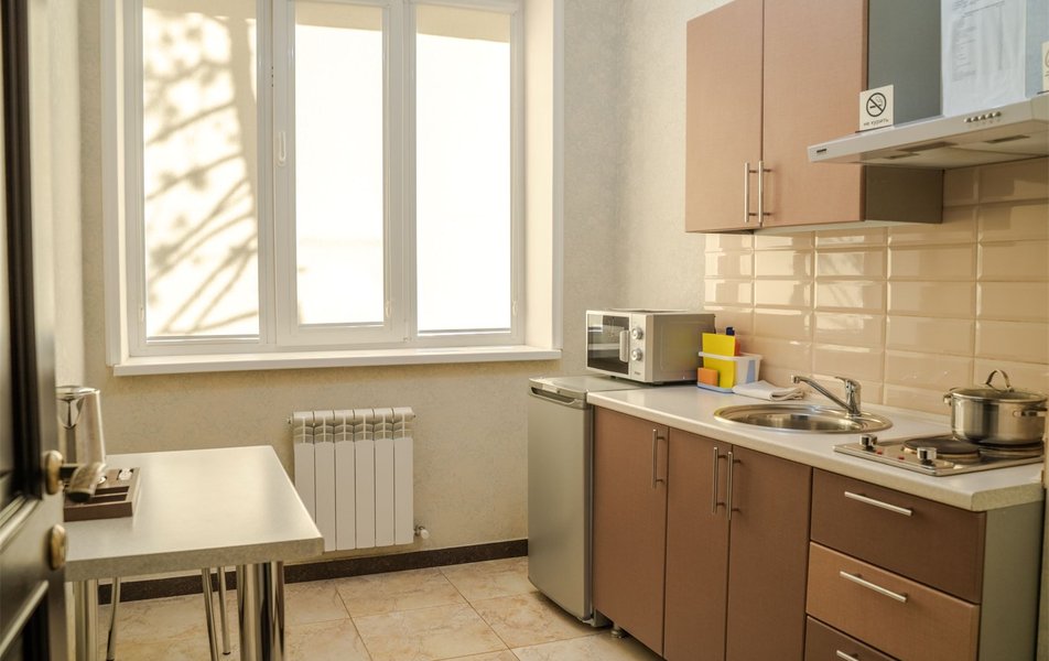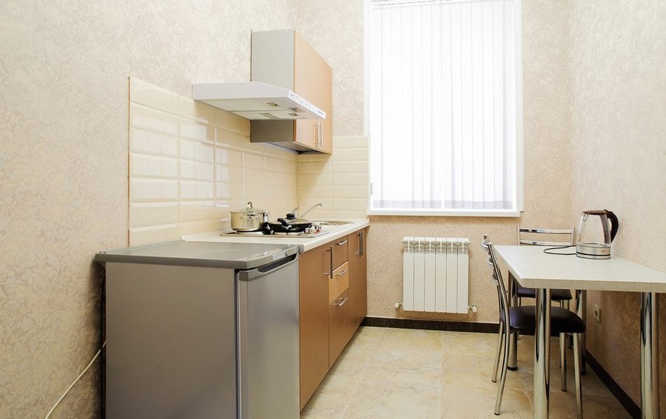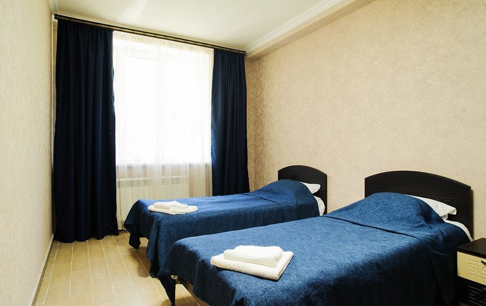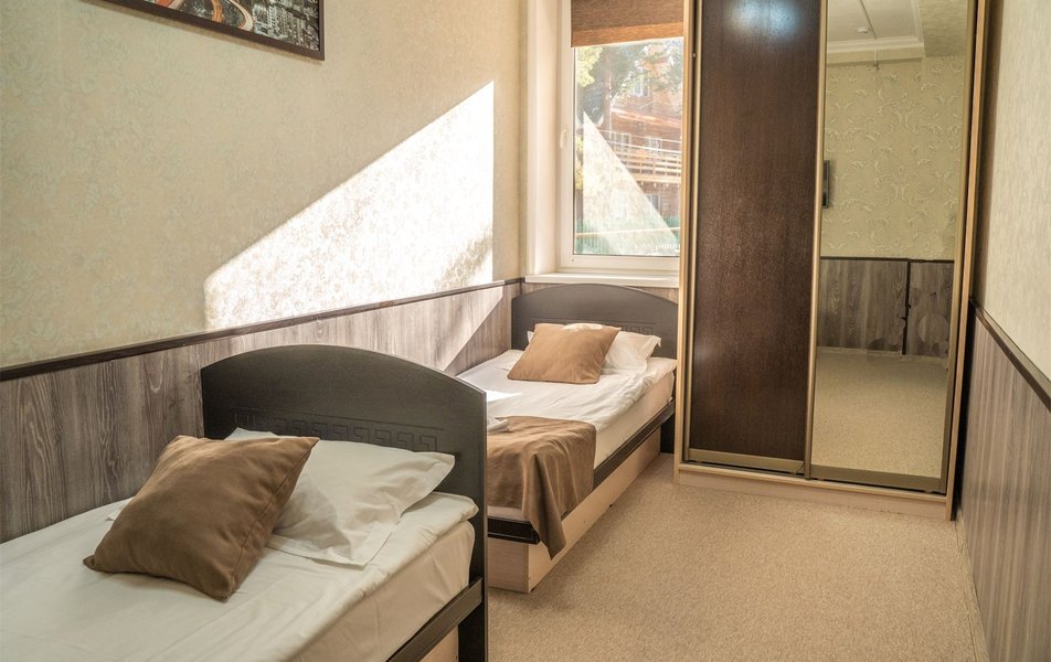 В номере: вешалка, зеркало, кровати односпальные, прикроватные тумбочки, стол, стулья, шкаф, Мини-кухня, набор посуды, плита электрическая, телевизор, холодильник, чайный набор посуды, электрочайник