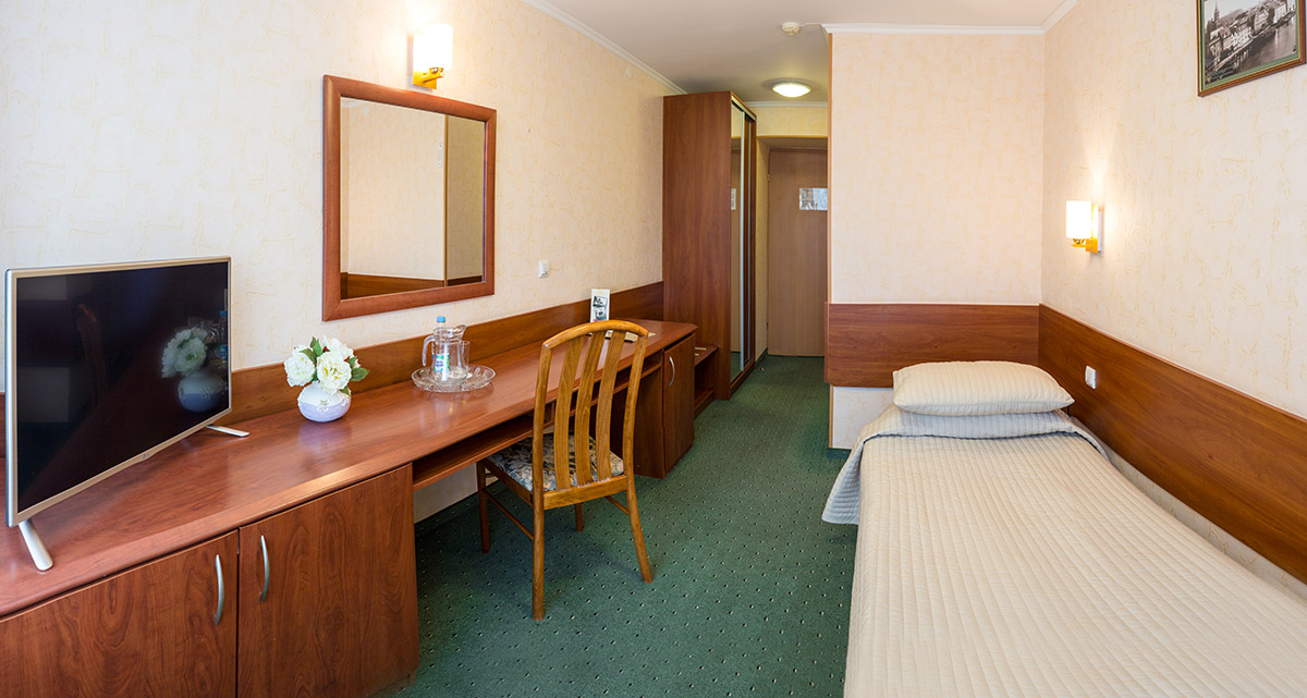 В номере: кровать односпальная, прикроватная тумба, письменный стол, платяной шкаф, стул, тумба для багажа, телевизор, холодильник