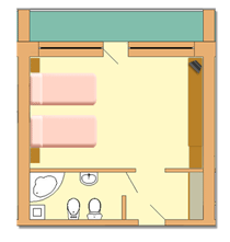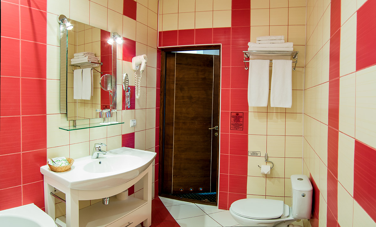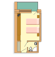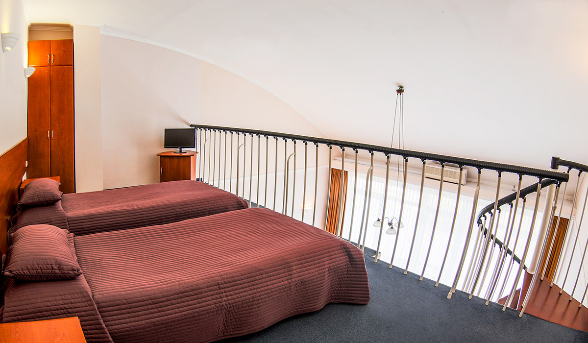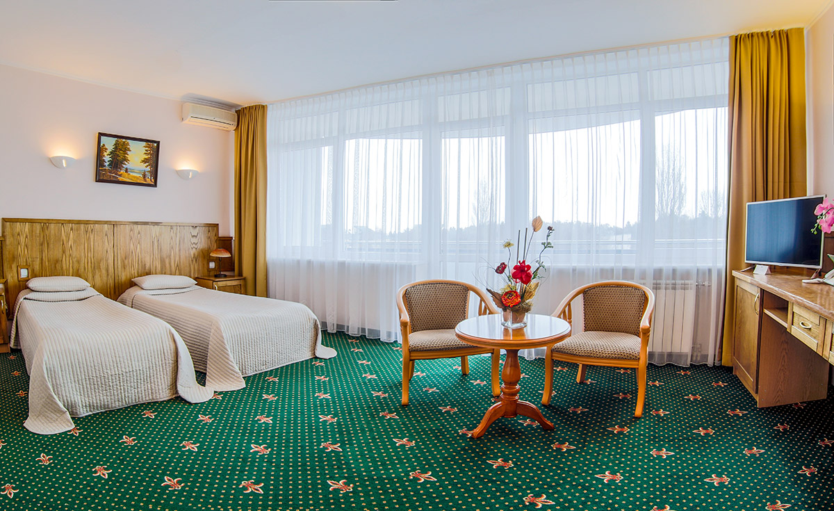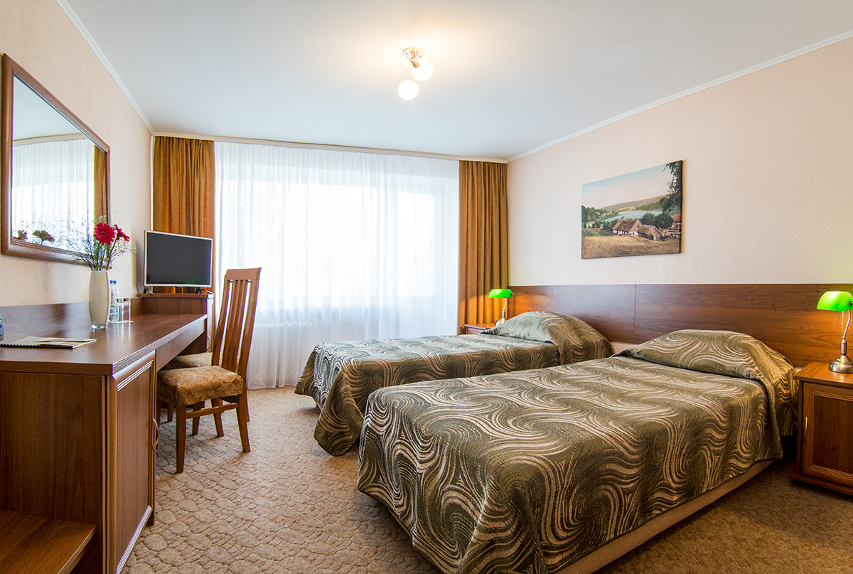 В номере: две односпальные или одна двуспальная кровать, прикроватная тумба, письменный стол, платяной шкаф, стул, тумба для багажа, телевизор, холодильник