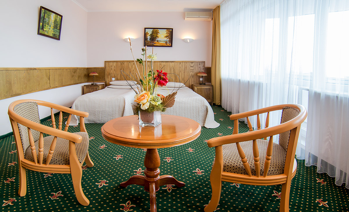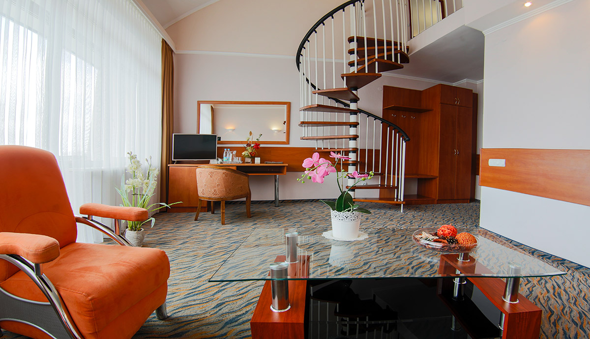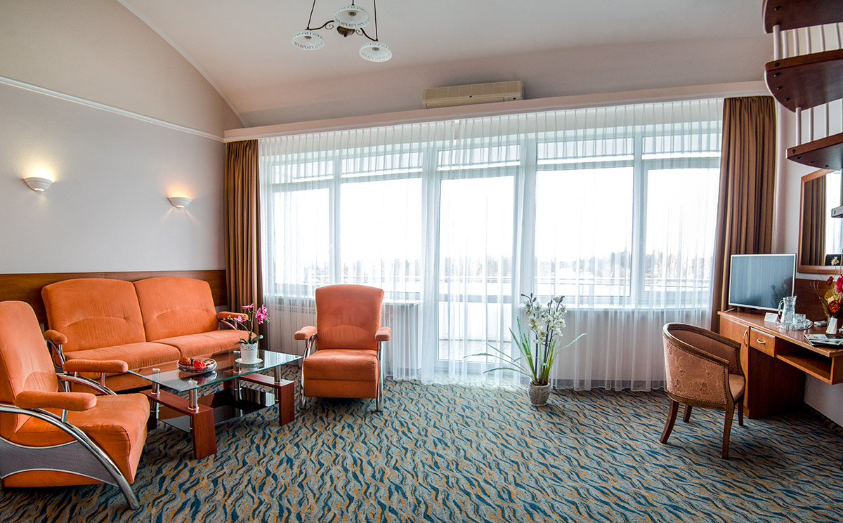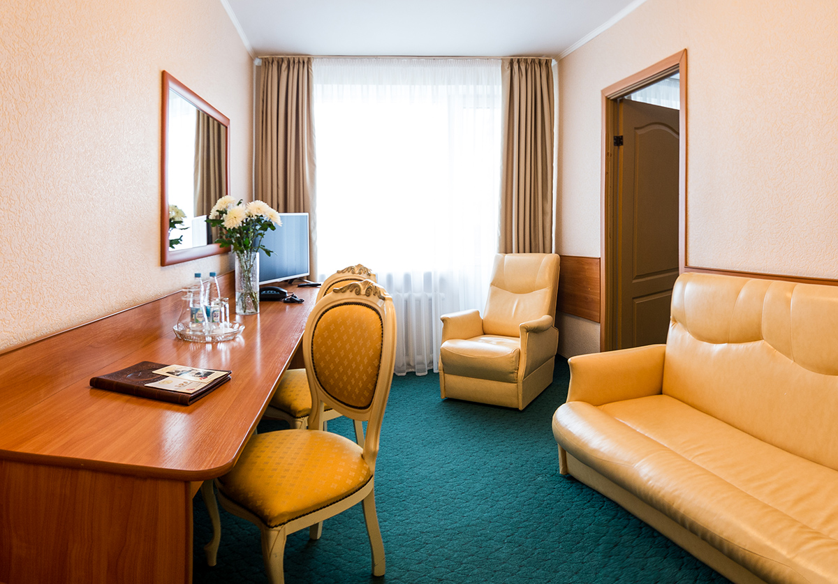 В номере: двуспальная либо две односпальные кровати, прикроватные тумбы, диван-кровать, письменный стол, стул, кофейный столик, 2 кресла, телевизор, холодильник, мини-бар, чайник, набор посуды, платяной шкаф, тумба для багажа, система управления микроклиматом